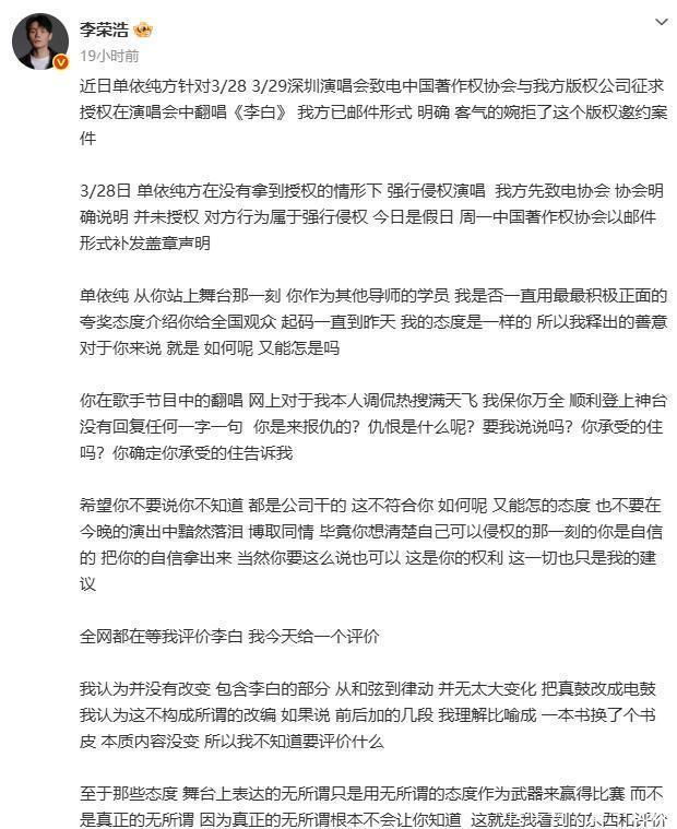 开云体育(中国)官方网站 事件握续升级!李荣浩发出四连问,强行侵权的单依纯口碑透顶垮塌